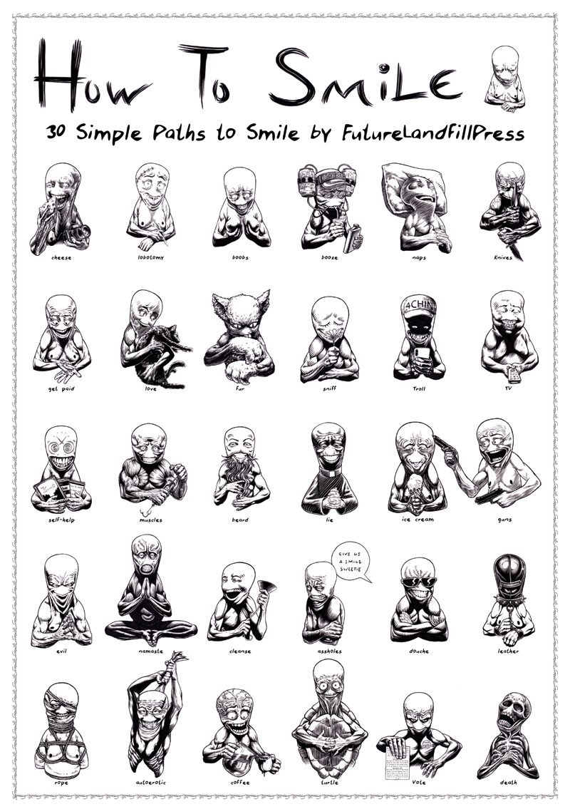This motivational poster collects my successful 2018 Inktober "How To Smile" project. All your favorites are here, Boobs, Cheese, Rope, Naps, and many more. All in all collecting 30 Simple Paths to Smile as chosen by me and motivational experts from around the globe.