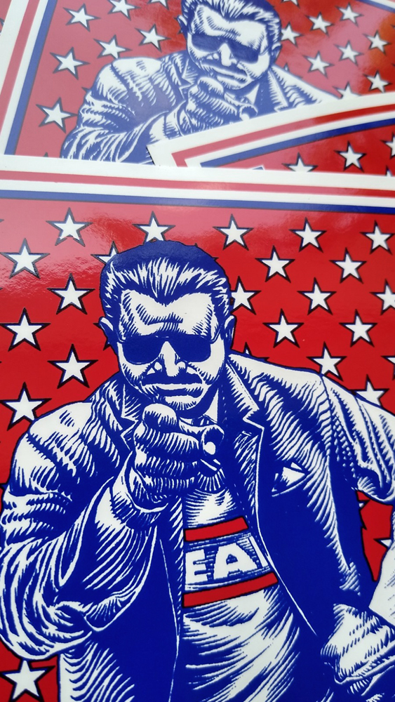 This is a two color screen printed vinyl sticker, it measures 4.25" x 5.5" it's big enough to cover most medium sized rust spots on your car. It's probably the most patriotic sticker I've ever been responsible for, hopefully my timing isn't off on the national sentiment. Secretly it's a promotion for my band, visit www.cashleech.com to get an earful of more of my high brow humor.